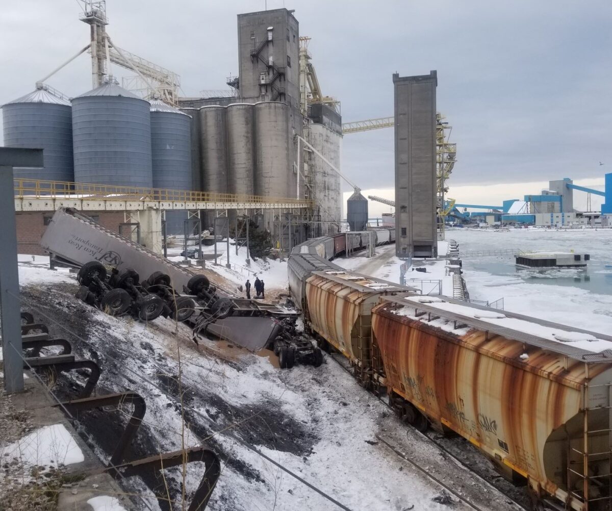 On February 1, 2021 at approximately 1:33 p.m. Huron County OPP, Goderich Fire Department (GFD) and Huron County Paramedic Services responded to the Goderich Grain Terminal on Harbour Street after receiving a 9-1-1 call from a witness that reported a freight train had derailed and collided with a pickup truck and an outbuilding.