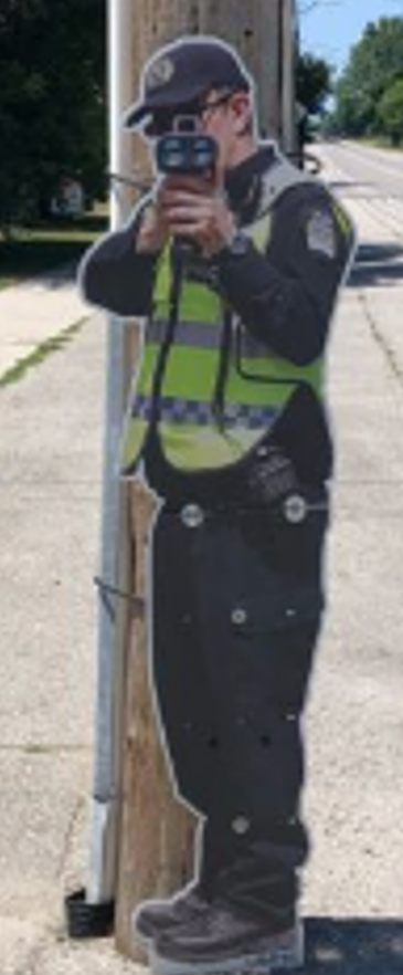 The life-size, two-dimensional aluminum cut-out of a police officer holding a speed enforcement device had been cable locked to a concrete light standard at the time of the theft.