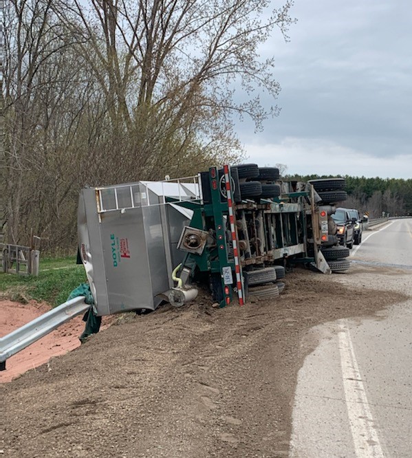This afternoon at approximately 4:30 p.m. Huron OPP officers, Goderich Fire Department and Huron County Paramedic Services responded to the crash scene located on Sharpes Creek Line near Forresters Line. Upon arrival officers located a tractor trailer overturned on the west shoulder of the roadway with a load of granular fertilizer spilled into the ditch.