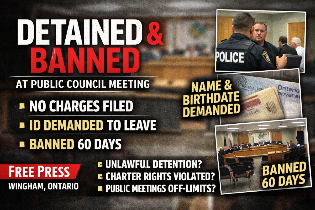(WINGHAM, North Huron) — A January 12 North Huron council meeting began with police ordering the entire public and press gallery to leave, detaining attendees long enough to demand identification under threat of arrest, and then issuing a 60-day ban—all without any charges, fines, or allegations of wrongdoing.