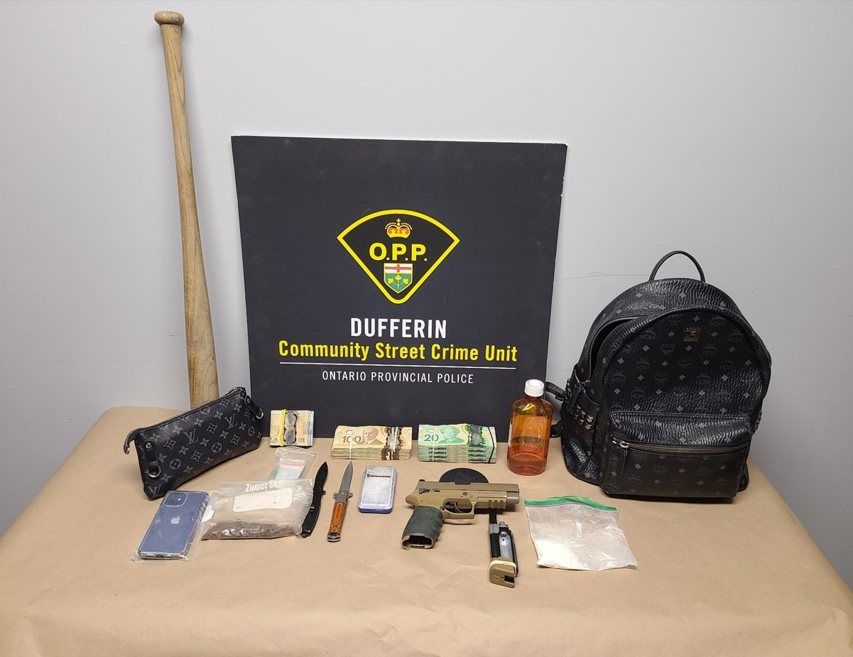 (DUFFERIN COUNTY) – Members of the Dufferin Detachment of the Ontario Provincial Police (OPP) have charged an Orton resident with multiple offences following a traffic stop that resulted in the seizure of a large quantity of cash, weapons, including an imitation firearm, and cocaine.