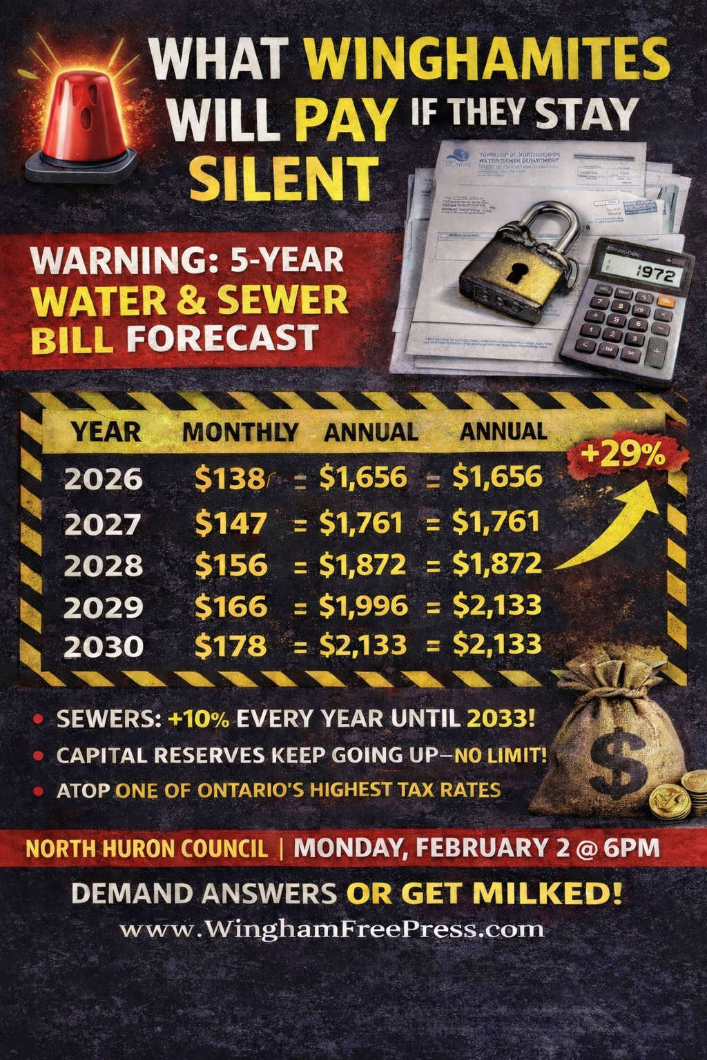 (Wingham, North Huron) — A current North Huron water and sewer bill confirms what many residents have suspected: utility costs are already high — and set to climb steadily for years, with no protection for ratepayers.